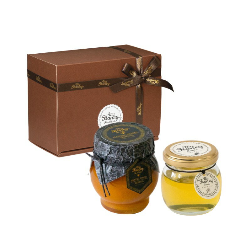 ラッピングブラウンギフトボックス(S) + MYHONEYロゴ入りリボンセット内容マヌカハニーメディカル(200g)【MGO400+ (UMF20+相当)】 + アカシアハニーM(90g)原材料マヌカハニーメディカル(200g)【MGO400+ (UMF20+相当)】:マヌカハニー(ニュージーランド産)アカシアハニーM(90g):蜂蜜(ハンガリー産)賞味期限マヌカハニーメディカル(200g)【MGO400+ (UMF20+相当)】:製造日より2年アカシアハニーM(90g):製造日より2年保存方法直射日光を避け、常温で保存してください。