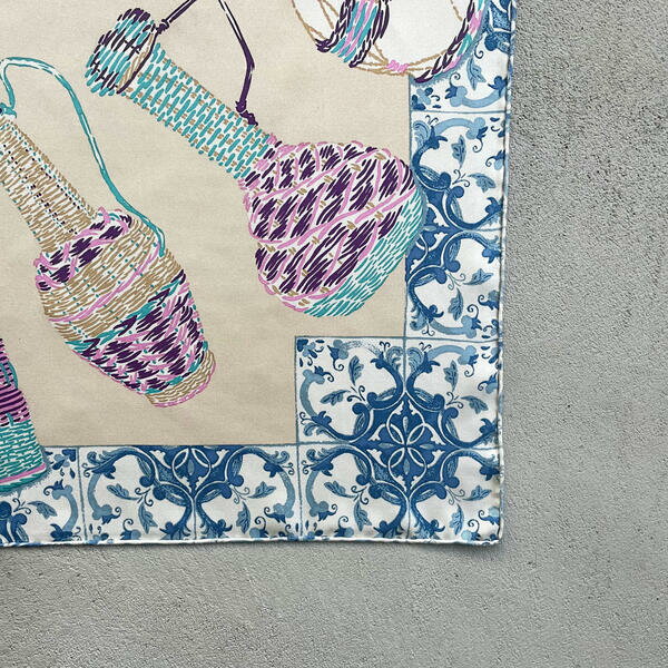 ビアッジョブルーの≪MANIPURI≫ウィッカーボトルシルクスカーフ。