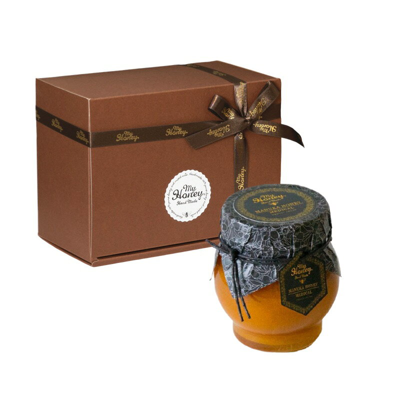 ラッピングブラウンギフトボックス(S) + MYHONEYロゴ入りリボンセット内容マヌカハニーメディカル(200g)【MGO400+ (UMF20+相当)】原材料マヌカハニー(ニュージーランド産)賞味期限製造日より2年保存方法直射日光を避け、常温で保存してください。