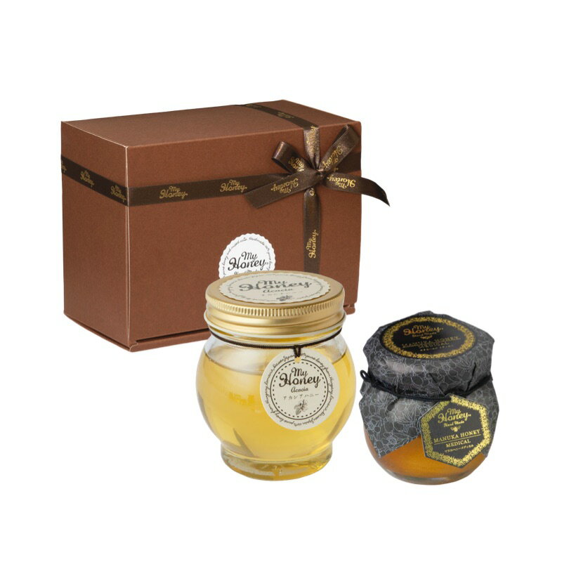 【生はちみつギフト】アカシアハニーL(200g) + マヌカハニーメディカル(90g)【MGO400+ (UMF20+相当)】 / ブラウンギフトボックス(S) + MYHONEYロゴ入りリボン