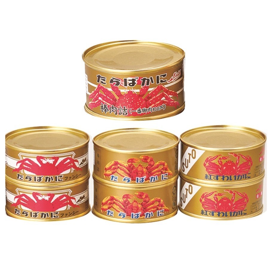内容量たらばがに一番脚肉缶詰115g×1、たらばがに脚肉缶詰55g×2缶、たらばがにほぐし身缶詰55g×2缶、紅ずわいがに缶詰60g×2缶 ご購入際の注意事項 ※イメージ画像は料理例や盛付例となっており、実際のセット内容に含まれないものがございます。