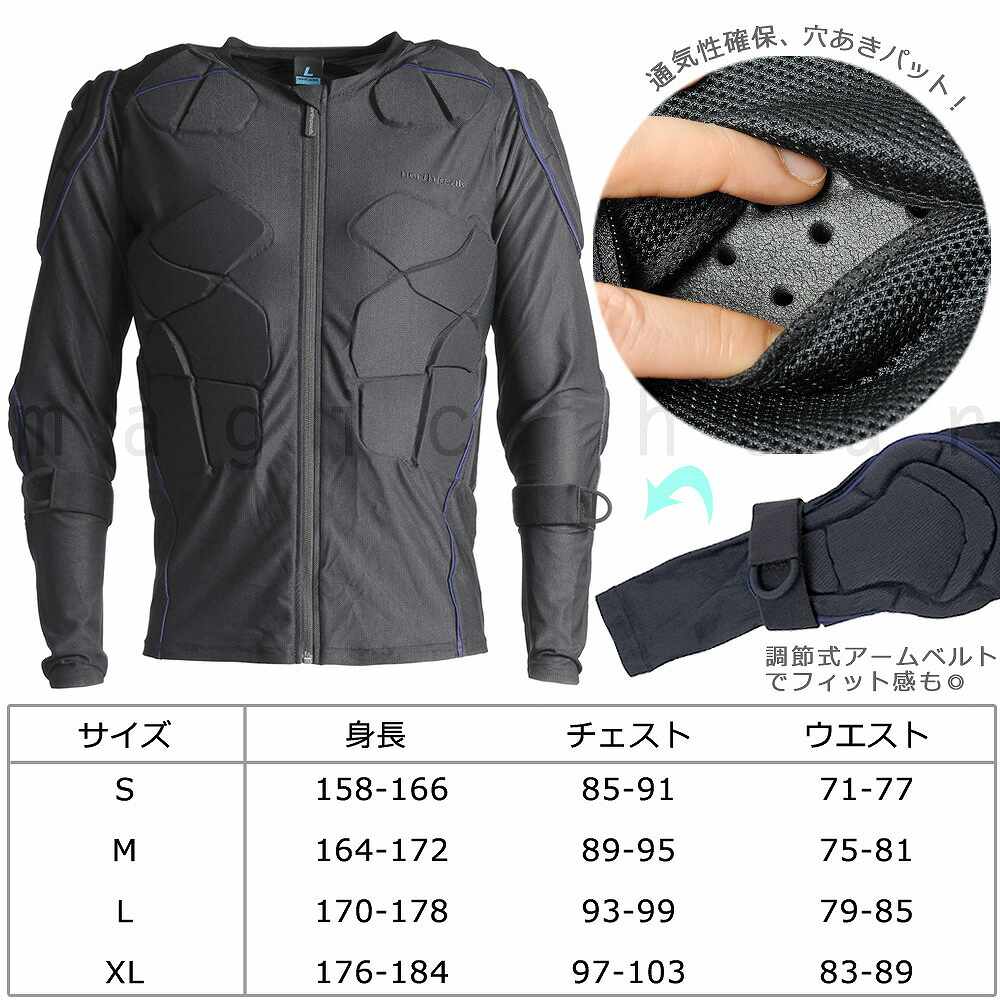 背中のパッドを体に密着させるインナーウエストベルトとエルボーパッドを固定する調節式アームベルトでフィット感◎ サイズ 参考サイズ 身長 / チェスト / ウエスト S 158-166 / 85-91 / 71-77 M 164-172 / 89-95 / 75-81 L 170-178 / 93-99 / 79-85 XL 176-184 / 97-103 / 83-89 (cm)
