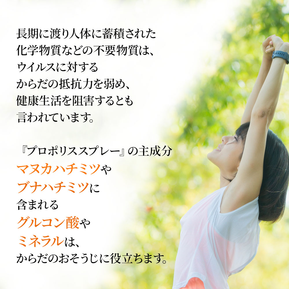 『プロポリススプレー』の主成分・マヌカハチミツやブナハチミツに含まれるグルコン酸やミネラルは、からだのおそうじに役立ちます。