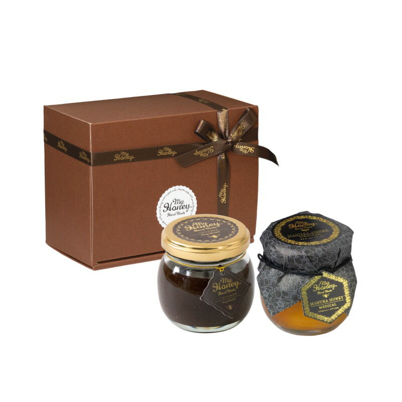 【生はちみつギフト】ハニーショコラM(90g) + マヌカハニーメディカル(90g)【MGO400+ (UMF20+相当)】 / ブラウンギフトボックス(S) + MYHONEYロゴ入りリボン